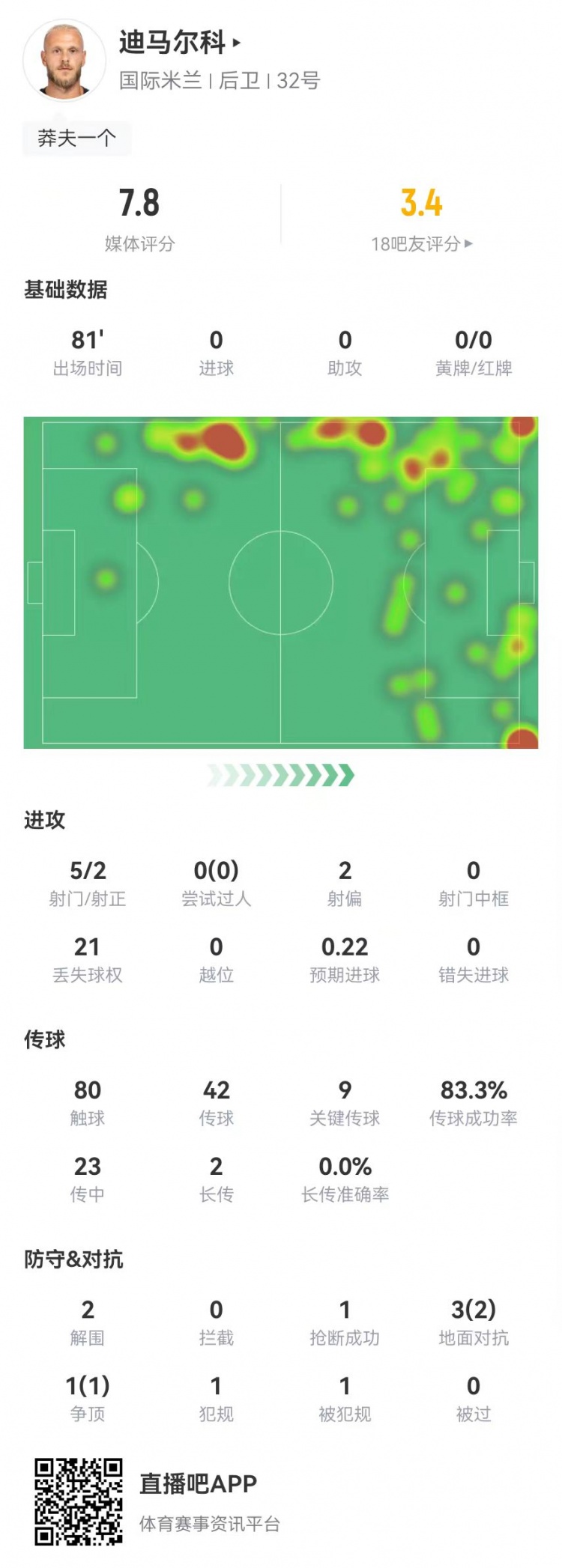 迪马尔科本场5射2正+9关键传送球 23传中+21丢失球权 获评7.8分
